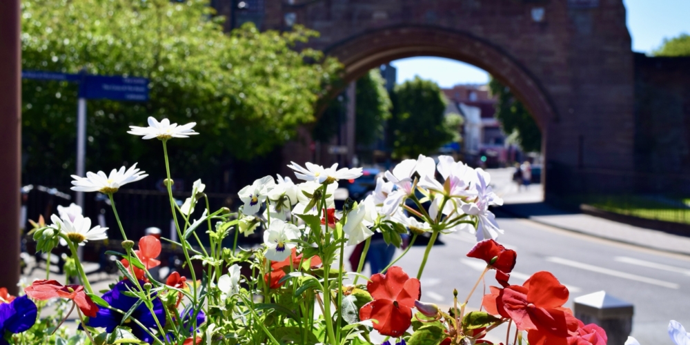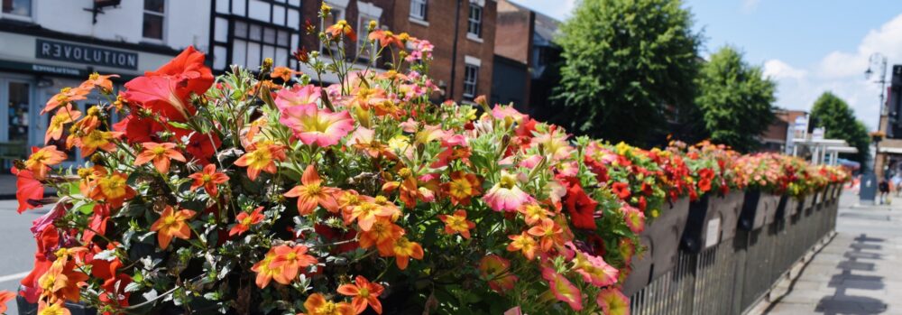 Did you know that we grow, plant and maintain the planted displays that are seen all around Chester? From the trailing plants adorning the Chester Rows and amphitheatre railings, to Grosvenor park and many of the hanging baskets you see outside of the pubs and restaurants in the city. Each year we work with the city planners to create a colour and planting scheme suitable for events over the year. We provide the plants and baskets seen outside the Town Hall and even provided additional displays when the Queen visited in 2018 & more recently home of the 100,000 flowers that hit the news in June 2024 for The Duke of Westminster & his wife’s wedding in Chester